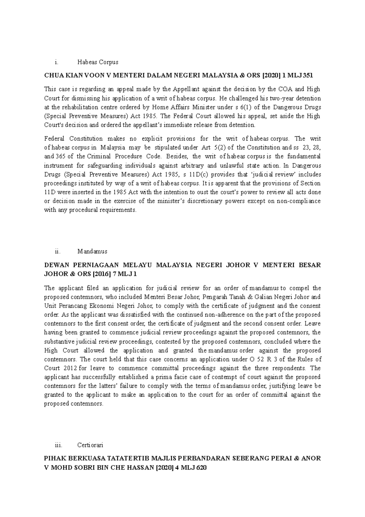 Tutorial 8 I Habeas Corpus Chua Kian Voon V Menteri Dalam Negeri Malaysia Amp Ors 2020 1 Mlj Studocu